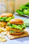 Butter and grill the buns, spread them with sauce, and top with crispy fish fillets and Boston lettuce leaves.