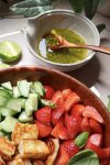 A delightful salad combining grilled halloumi cheese, crisp cucumber and juicy strawberries over al dente orzo pasta. Perfect as a main-salad or vibrant summer side dish with contrasting textures and flavors.