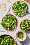 Ajouter les croûtons de halloumi à la salade et touiller avec la vinaigrette. Servir aussitôt.